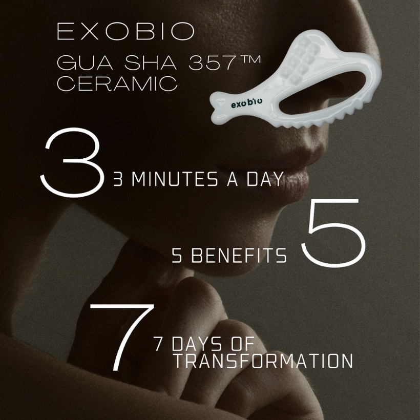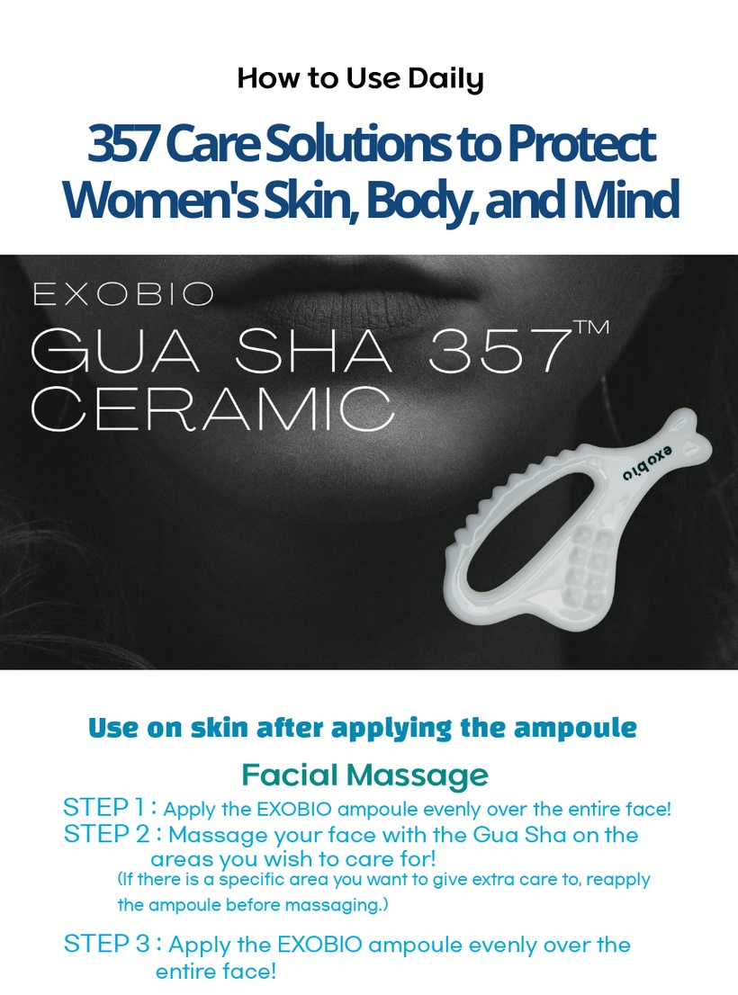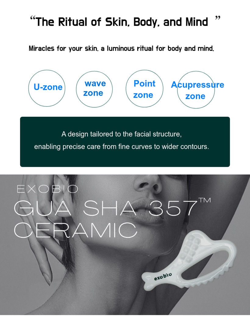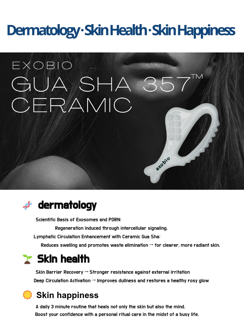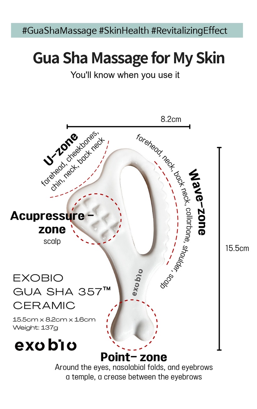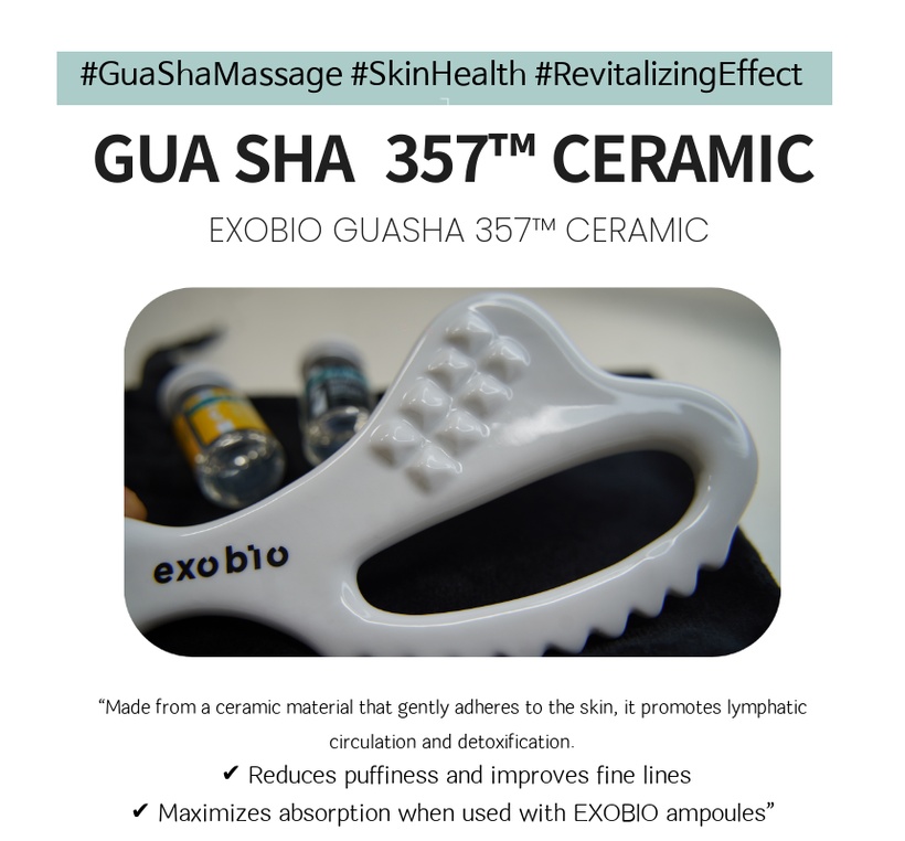 Crafted using premium ceramic techniques, the Gua Sha helps active ingredients penetrate deep into the skin when used with the EXOBIO BIO 357™ line of ampoules, promoting blood circulation, lymphatic flow, and lifting elasticity.